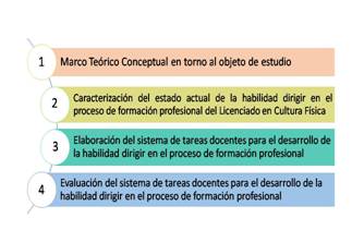 La problemática que se propone resolver la investigación en curso es el insuficiente trabajo con la habilidad dirigir en el proceso de formación profesional del estudiante de la Universidad de Ciencias de la Cultura Física y el Deporte “Manuel Fajardo” y su objetivo general se enmarca en elaborar un sistema de tareas docentes que contribuya a desarrollar la habilidad dirigir en el proceso de formación profesional del licenciado en Cultura Física de la Universidad de Ciencias de la Cultura Física y el Deporte “Manuel Fajardo”.