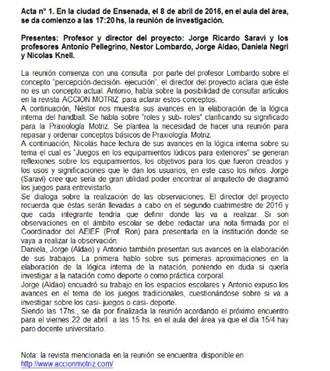 La visita e incorporación temporal de una estudiante de maestría y colega mexicana que se realizaba una pasantía en la UNLP (Metztli Alejandra López Torres, de la UANL), generó resultados positivos y reanimó la labor investigativa, además de incorporar recursos metodológicos que todavía no eran utilizados en el grupo de trabajo. Entre ellos se destacan la elaboración sistemática de actas de las reuniones, donde se grababa o se registraba por escrito todos los temas que eran abordados en cada encuentro. Esta forma de trabajo, sistematizada y sostenida hasta la actualidad, consiste en que un integrante es designado en cada encuentro para llevar adelante el registro, elaboración y posterior difusión de un acta de la reunión a través de medios digitales (correo electrónico, nube de internet). Cada relato escrito -o acta-, contiene un compendio de los debates del grupo de ese día, así como el desarrollo de cuestiones conceptuales o de perspectivas metodológicas del trabajo que fueron abordadas (ver imagen 1).