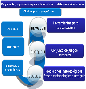 El programa elaborado se estructuró en tres bloques fundamentales, que contienen las indicaciones metodológicas, el conjunto de juegos menores y la forma de evaluar el desarrollo de las habilidades motrices básicas en párvulos de 3 y 4 años.