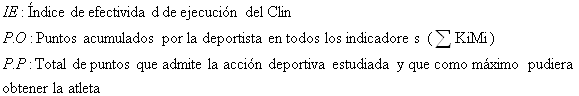 Los pasos descritos anteriormente facilitaron obtener información sobre el comportamiento de los indicadores fundamentales del clin; lo que permitió valorar el nivel de calidad en la técnica de ejecución, de la destreza motriz, que poseen las atletas estudiadas.