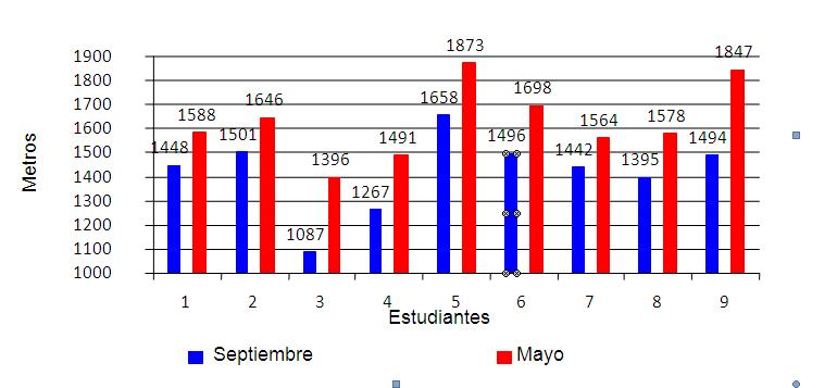 En cuanto a la prueba de capacidad física de resistencia aerobia de los 9 min: los 20 estudiantes corrieron 30782 m, para una media de todo el grupo de 1539,1 m por estudiante, y en la segunda prueba los 20 atletas recorrieron 35369 m ubicándose la media en 1768 m, por lo que hubo un incremento de metros entre la primera y la segunda prueba de 4587 m, así como un incremento de la media de 228,9 m.
