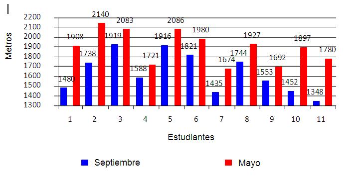 En lo referente al balance realizado entre la prueba inicial y la prueba final de esta prueba, en el sexo femenino, se recorrieron 12788 m y la media se ubicó en 1420 m y 88 cm mientras que en la segunda prueba se recorrió en 14481 m y la media de este se ubicó en 1609 m, por lo que existe una diferencia entre la cantidad de metros recorridos entre la primera y la segunda prueba de 1693 m y la media entre ellos se ubicó en 18812 m. (Ver gráfico 3)