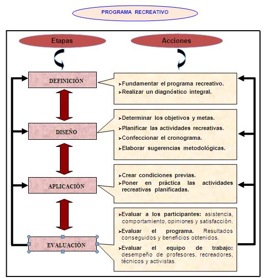 En el trabajo se aporta una estructura para el diseño del programa recreativo, la misma consta de cuatro etapas: definición, diseño, aplicación y evaluación, cada una con sus correspondientes acciones que, en el orden práctico, harán posible conducir el proceso recreativo con un enfoque formativo orientado a la educación para el tiempo libre de los sujetos.