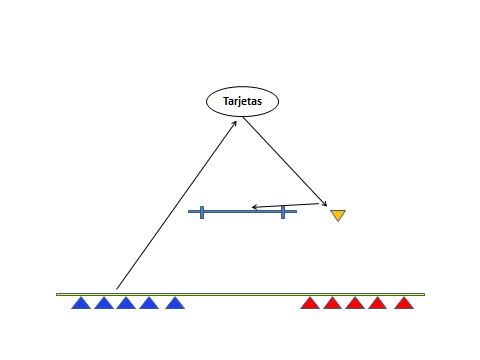 Desarrollo: El entrenador escogerá el equipo que comenzará el juego y dirá el número del integrante que comenzará. El jugador en turno se desplazará corriendo lo más rápido posible hacia donde se encuentran las tarjetas, escogerá una y ejecutará el ejercicio descrito. El movimiento será evaluado por el equipo contrario con un valor máximo de hasta 20 puntos. Por cada error que logren detectar se descontará un punto. Posteriormente ejecutará el juego el mismo número que corresponde al equipo contrario. Se mencionarán los números hasta que todos participen