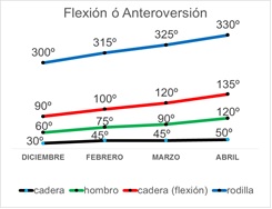 Gráfico 2. Resultados de la goniometría en los movimientos de flexión y anteroversión. Solo aparecen los movimientos que mejoran mientras menor amplitud alcanza