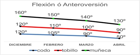 El tercer parámetro medido fue el codo, de color azul; esta articulación fue bastante complicada de tratar, ya que era una de las zonas con mayor espasticidad. Comenzó con 120º en el diagnóstico del mes de diciembre, luego disminuyó 15º en el mes de febrero, posteriormente obtuvo 15º menos que en la medición anterior y finalizó con una disminución de 40º en la medición final, debido a la propia disminución de espasticidad en la articulación. Mejora en total 70º, obtiene 50º y sobrecumple con el ángulo de amplitud articular funcional.
