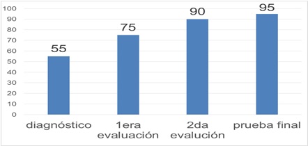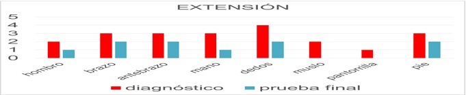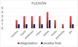 Se observa en el gráfico 4 cómo los valores del diagnóstico alcanzan en su mayoría el valor de 3 puntos y en el caso de los dedos alcanza los 4 puntos, lo cual evidencia el alto grado de espasticidad que presentaba el paciente. No obstante, las partes más afectadas por la espasticidad eran las extremidades superiores y las zonas más distales como el pie. Después de un duro trabajo por un periodo de cuatro meses, se decidió mostrar los resultados del diagnóstico y el de la prueba final pasados los 5 meses, con el objetivo de que se pudieran apreciar mejor los cambios.