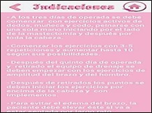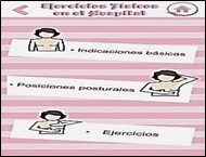 Al seleccionar la opción Ejercicios físicos de la ventana de presentación, los usuarios podrán visualizar una ventana con tres propuestas: En el hospital, En la casa y en la parte superior derecha un botón que le posibilita regresar a la ventana de inicio. La opción En el hospital remite al usuario a la siguiente ventana, donde se pueden visualizar, aparte de lo anteriormente referido, tres propuestas: Indicaciones básicas, Posiciones posturales y Ejercicios a realizar en esta etapa hospitalaria. Ver figura 4.