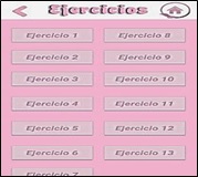 Cuando se seleccione la opción Ejercicios, el usuario se remitirá a la siguiente ventana con una lista de ejercicios enumerados del 1 hasta el 13, donde al realizar la elección de uno de ellos, se mostrará en otra ventana la explicación del mismo, así como su gráfica. Estas ventanas poseen los botones de retorno y de inicio. Ver Figura 6.