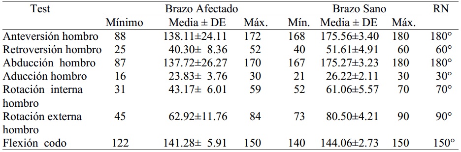 Los resultados obtenidos en el brazo sano muestran que existe una pérdida entre cuatro y once grados, donde los movimientos más afectados son los de rotación. Se observan diferencias significativas en las mediciones entre el mismo movimiento de los dos brazos (afectado y sano) que oscilan entre los 3º en la flexión del codo hasta los 38º en la anteversión y la abducción del hombro. Ver tabla 2.