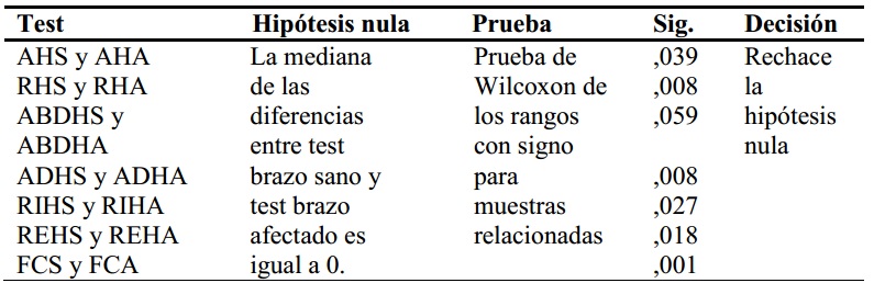 Fuente: IBM SPSS Statistic Visor. Nivel de significación 0,05Nota. AHS=anteversión hombro sano; AHA=anteversión hombro afectado; RHS=retroversión hombro sano; RHA=retroversión hombro afectado; ABDHS=abducción hombro sano; ABDHA=abducción hombro afectado; RIHS=Rotación interna hombro sano; RIHA=Rotación interna hombro afectado; REHS=Rotación externa hombro sano REHA=Rotación externa hombro afectado FCS=flexión codo sano; FCA=flexión codo afectado