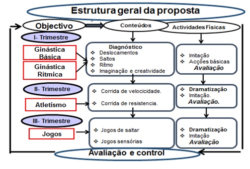 No primeiro trimestre as actividades físicas se correspondem com os conteúdos que foram selecionados das unidades de Ginástica Básica que são deslocamentos e saltos, assim como os de Ginástica rítmica, que são canções com rítmo, imaginação e criatividade. Terminando o primero trimestre se realiza uma avaliação parcial que permitirá apreciar se as actividades físicas estão sendo assimiladas de forma adequada.