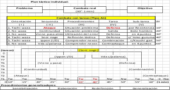 Al interior del contenido se establecen pequeños planes de acciones que se sintetizan en la preparación del yudoca para el desarrollo de la habilidad solucionar problemas, a través de combates con tareas de orientación técnico-táctica, según las condiciones o recursos personales con que cuenta. De ahí la importancia de que la estructura del plan táctico se argumente sobre los contenidos más esenciales del campo táctico de este deporte; identificados en la etapa de iniciación de los yudocas con los movimientos básicos de ataque, contrataque y defensa.