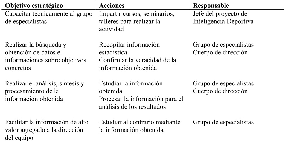 La capacitación de especialistas mediante los objetivos estratégicos, acciones y responsables permite la aplicación de los componentes: Inteligencia Organizacional, Competitiva y Contrainteligencia para obtener información con nivel estratégico sobre las fortalezas y debilidades de los equipos; así como proteger la información confidencial que permite la ventaja competitiva.