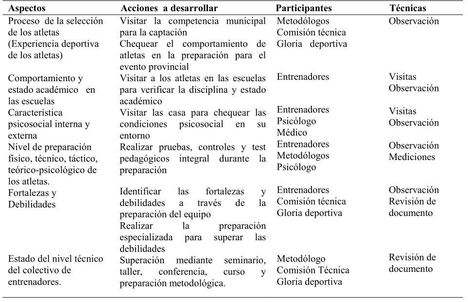 Estado del nivel técnico del colectivo de entrenadoresA partir de estos aspectos se elaboraron las acciones a desarrollar, los participantes involucrados y las técnicas a realizar dentro del componente de Inteligencia Organizacional. Ver tabla 2.