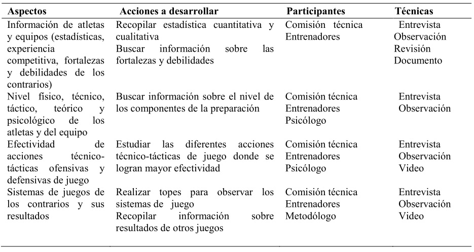 La Inteligencia Deportiva como conjunto de acciones prevé cambios necesarios que permiten la organización de los procesos en los entrenamientos y competencias del equipo. Además, brinda el conocimiento de los contrarios a través de la búsqueda de información actualizada y la toma de decisiones.