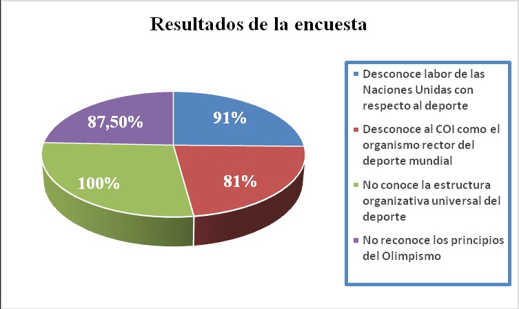 En la encuesta a los 3 grupos de estudiantes de primer año del CD se reflejó que el 91 % desconoce la labor de las Naciones Unidas con respecto al deporte, el 81 % no conoce que el COI es el organismo rector del deporte mundial, el 100 % no tiene dominio de la estructura organizativa universal del deporte y el 87.50 % no reconoce los principios del Olimpismo. Ver gráfico 1.Gráfico 1