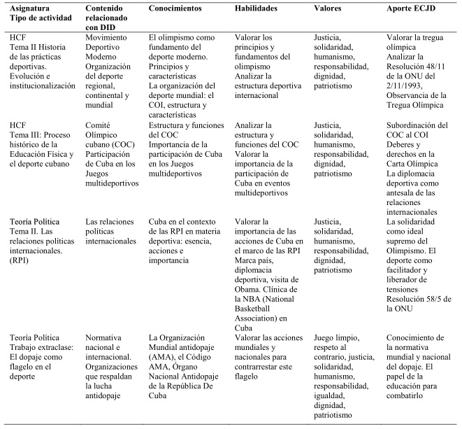 Desde estas dos asignaturas se muestran los conocimientos que posibilitan la educación cívico-jurídica-deportiva, que se codifican en el Derecho Internacional del Deporte. Ver tabla 1.Tabla 1