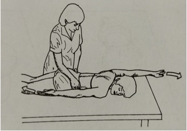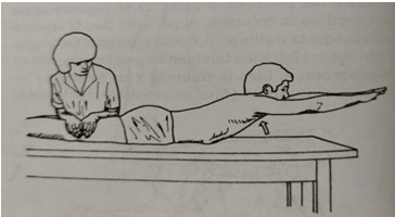 Estiramiento de la columna lumbar, con el paciente estabilizando el tórax en extensión y el rehabilitador estabilizando la pelvis