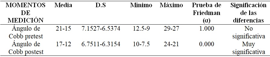 En seis meses de tratamiento los cambios del ángulo de Cobb fueron significativos, pero en el grupo de tratamiento la mejoría (15°) fue mayor que en el grupo control (7°), a pesar de tratarse de un ensayo clínico aleatorio. En esta etapa se corrigieron la deformidad entre 2 y 3 grados con valores de muy significativo (0.000).