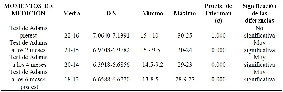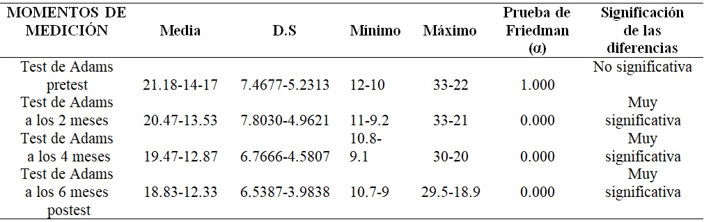 El test de Adams facilita la medición de la deformidad de la espalda torácica en correspondencia con la protuberancia de la giba dorsal. La muestra inició mediciones de 21.18-14.17 (p=1.000) con una marcada mejoría en los resultados en la medida en que el tratamiento avanzó. Los valores son positivos y muy significativos (P=0.000). Ver tabla 5.