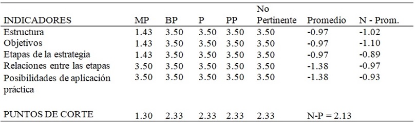 Por último, se estableció la imagen de los valores, promedios y puntos de corte según se muestra en la figura 1. Todos los valores de N-P están por debajo de 1.30, lo que indica un consenso general en los criterios de los expertos, quienes consideran los aspectos valorados de muy pertinente, pues los resultados de estos se ubican antes del punto de corte que define dicha categoría. Ver figura 1 y tabla 2.