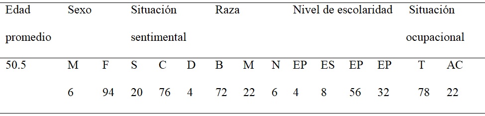 El promedio de edad de los participantes fue de 50.5 años. Prevaleció el sexo femenino con 47 mujeres que representa el 94 %, y tres hombres (6 %). Según el estado civil 10 son solteros, que representan el 20 %; mientras que 38 son casados (76%) y dos divorciados (4%). En cuanto al color de la piel 36 pacientes son blancos (72 %), 11 mestizos (22 %) y tres negros (6 %). En el nivel de escolaridad de la muestra se evidencia que 2 solo cursaron estudios primarios (4%); 4, estudios secundarios (8 %); 28, estudios preuniversitarios (56%); y el 32 %, o sea, 16 pacientes cursaron estudios universitarios.