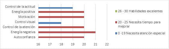 De igual forma Aguirre-Loaiza et al. (2015) indican que su población investigada presentó una puntuación por debajo de 17 puntos, según la valoración del test de Loehr, en lo referente al control de atención y autoconfianza, lo que constituía un problema para el desarrollo del equipo.