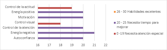 Según lo observado en la figura 1 los valores más altos demuestran que las jugadoras necesitan tiempo para mejorar, específicamente en lo relacionado a la energía positiva, motivación, control de la atención, energía negativa y autoconfianza. Ahora bien, un menor grupo de jugadoras se encuentran en el grupo que necesita atención especial, específicamente en lo referente al control de actitud y control visual, por lo que deben entrar en proceso de entrenamiento más exhaustivo.