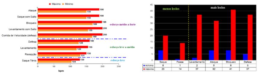Esforço dos fundamentos do voleibol pela FC em bpm e percentual de lesões conforme o fundamento.