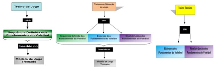 O treino de jogo, esses dois últimos conteúdos não são utilizados (esforço dos fundamentos e lesão dos fundamentos), não são utilizados porque nessa sessão não é possível do treinador possuir um controle subjetivo dos esforços dos fundamentos e consequentemente não consegue estruturar a sessão conforme o nível de lesão dos fundamentos (Marques Junior, 2014; 2018). O treino de jogo somente utiliza na sessão a sequência definida dos fundamentos do voleibol conforme o modelo de jogo da equipe (Marques Junior, 2019b). A figura 2 apresenta os três conteúdos interconectados que cada treino com bola do voleibol utiliza na sua sessão.