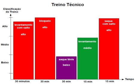O gráfico da classificação (ver figura 3) do treino técnico e/ou do treino em situação de jogo é um parâmetro para o técnico de voleibol estruturar a carga de treino subjetivamente antes dos jogadores realizarem a sessão (Marques Junior, 2020d). Nesse gráfico está inserido os três conteúdos interconectados da periodização específica para o voleibol e a estruturação do trabalho é conforme os objetivos do treinador para melhorar a equipe. O gráfico da classificação do treino com bola só pode ser utilizado pelo treinador de voleibol no treino técnico e/ou no treino em situação de jogo porque nessas sessões é possível do técnico realizar um controle subjetivo do esforço dos fundamentos e consequentemente da lesão do fundamento no atleta de voleibol (Marques Junior, 2019b).